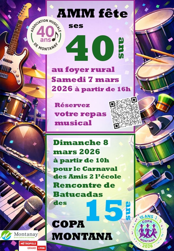 2026 est une année exceptionnelle pour l’Association Musicale de Montanay qui fête 🥳 40 ans de l’association, 🥁 15 ans de la batucada COPA MONTANA, lors d’un grand week-end festif les samedi 7 et dimanche 8 mars ! 🎶Concert et soirée d’anniversaire des 40 ans de l’Association Musicale de Montanay : 📆  Samedi 7 mars à […]