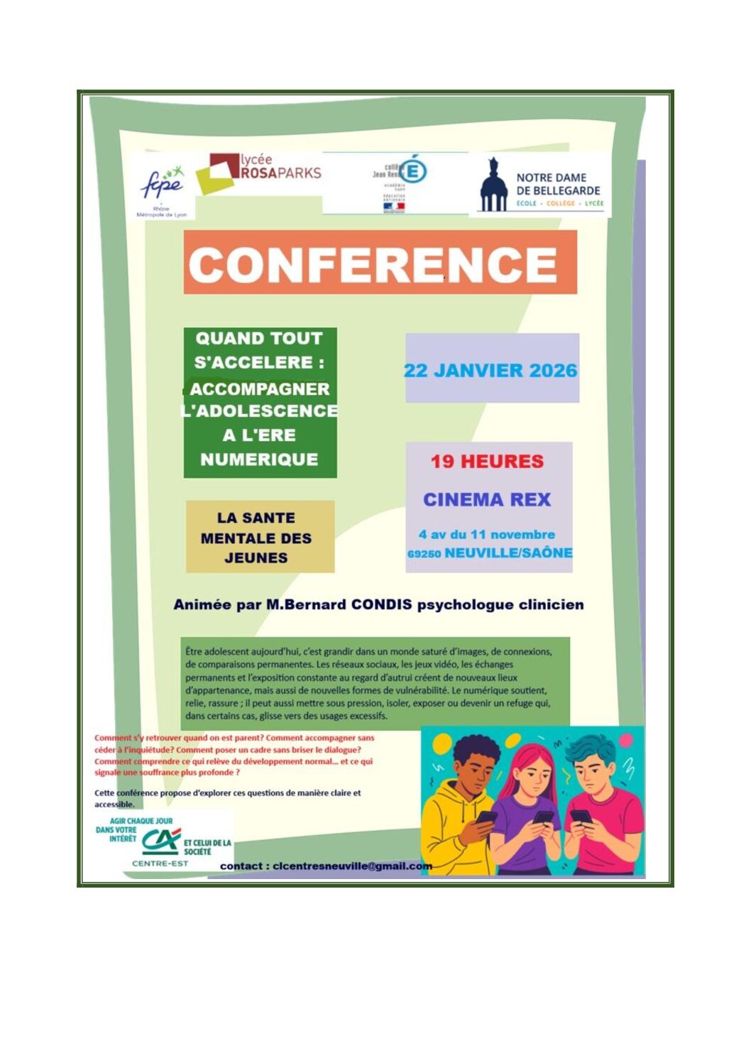 conférence sur la santé mentale des jeunes animée par Bernard CONDIS, psychologue clinicien jeudi 22 Janvier 2026 à 19H au Cinéma Rex de NEUVILLE-SUR-SAÔNE
