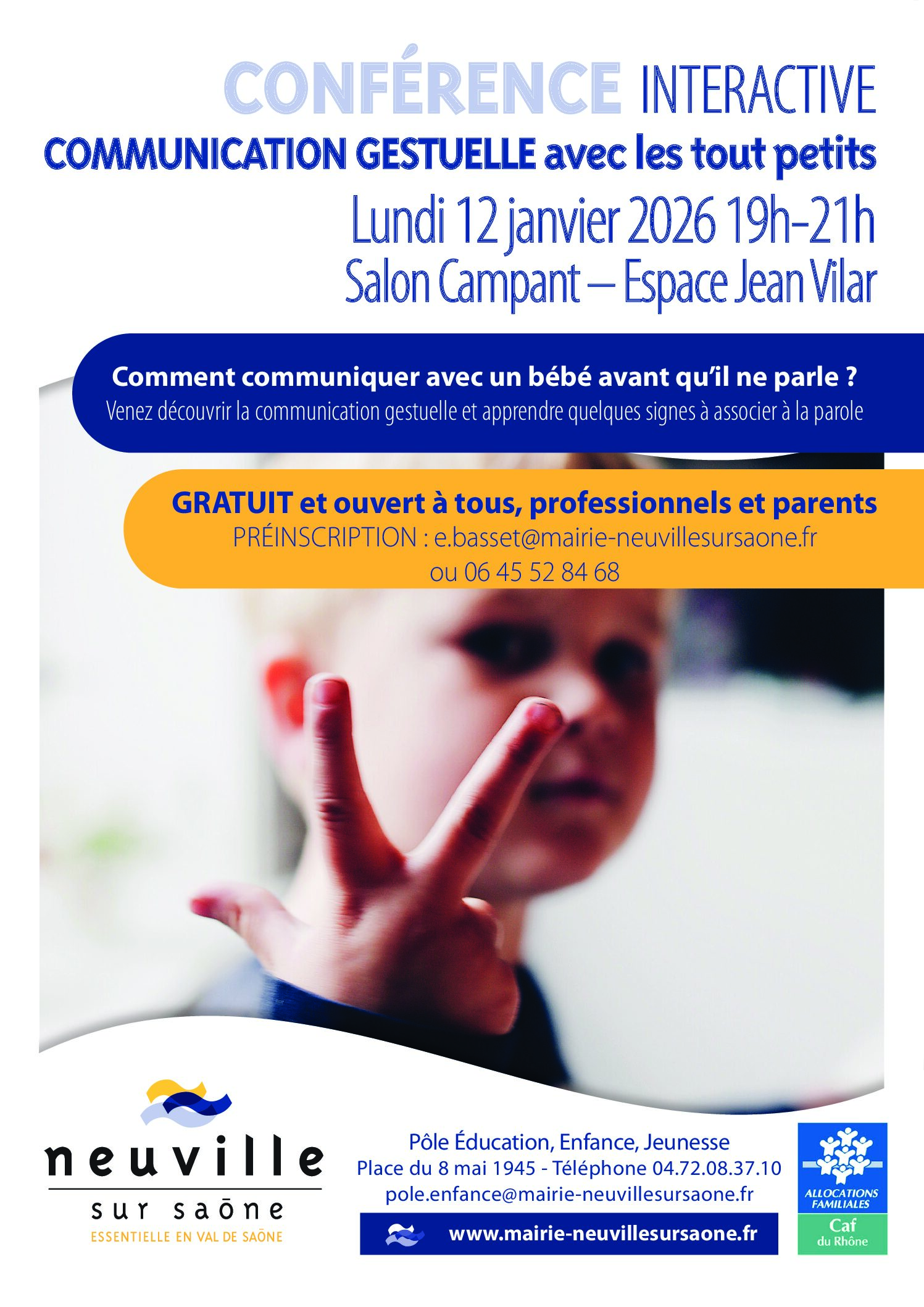 Lundi 12 janvier 2026 19h-21h - Salon Campant – Espace Jean Vilar Comment communiquer avec un bébé avant qu’il ne parle ? Venez découvrir la communication gestuelle et apprendre quelques signes à associer à la parole GRATUIT et ouvert à tous, professionnels et parents PRÉINSCRIPTION : e.basset@mairie-neuvillesursaone.fr ou 06 45 52 84 68